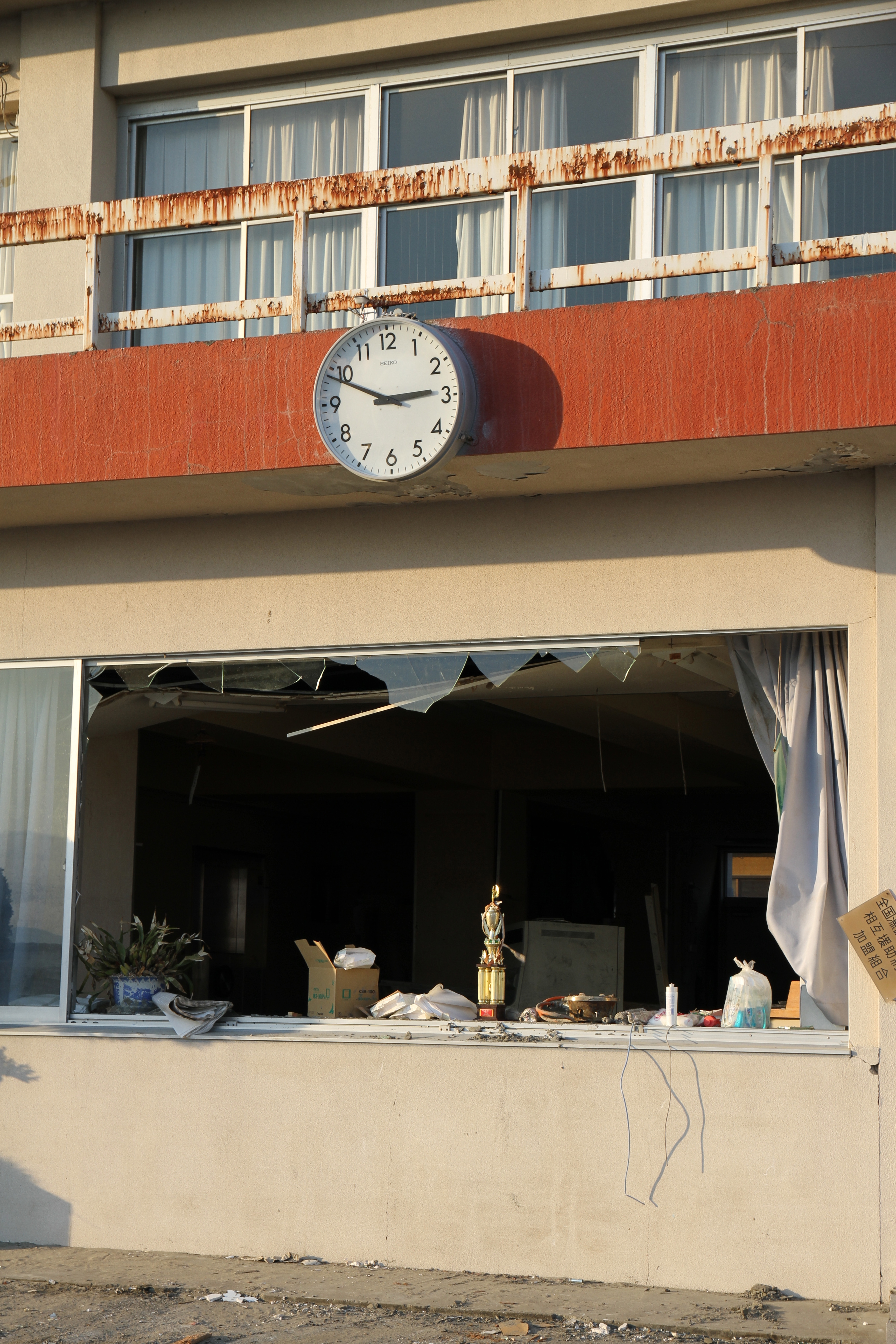 Takikawa-san and I were finished with our volunteer work and I had yet to see the shoreline. He lives in the area and agreed to take me up in his Prius towards Fukushima. We visited Otsu and Hirakata ports on the Ibaraki side, both hard hit by the earthquake and tsunami. We both froze when we saw the clock on the Otsu Port Fisheries Office. “Take a lot of pictures and tell the world we got hit too”