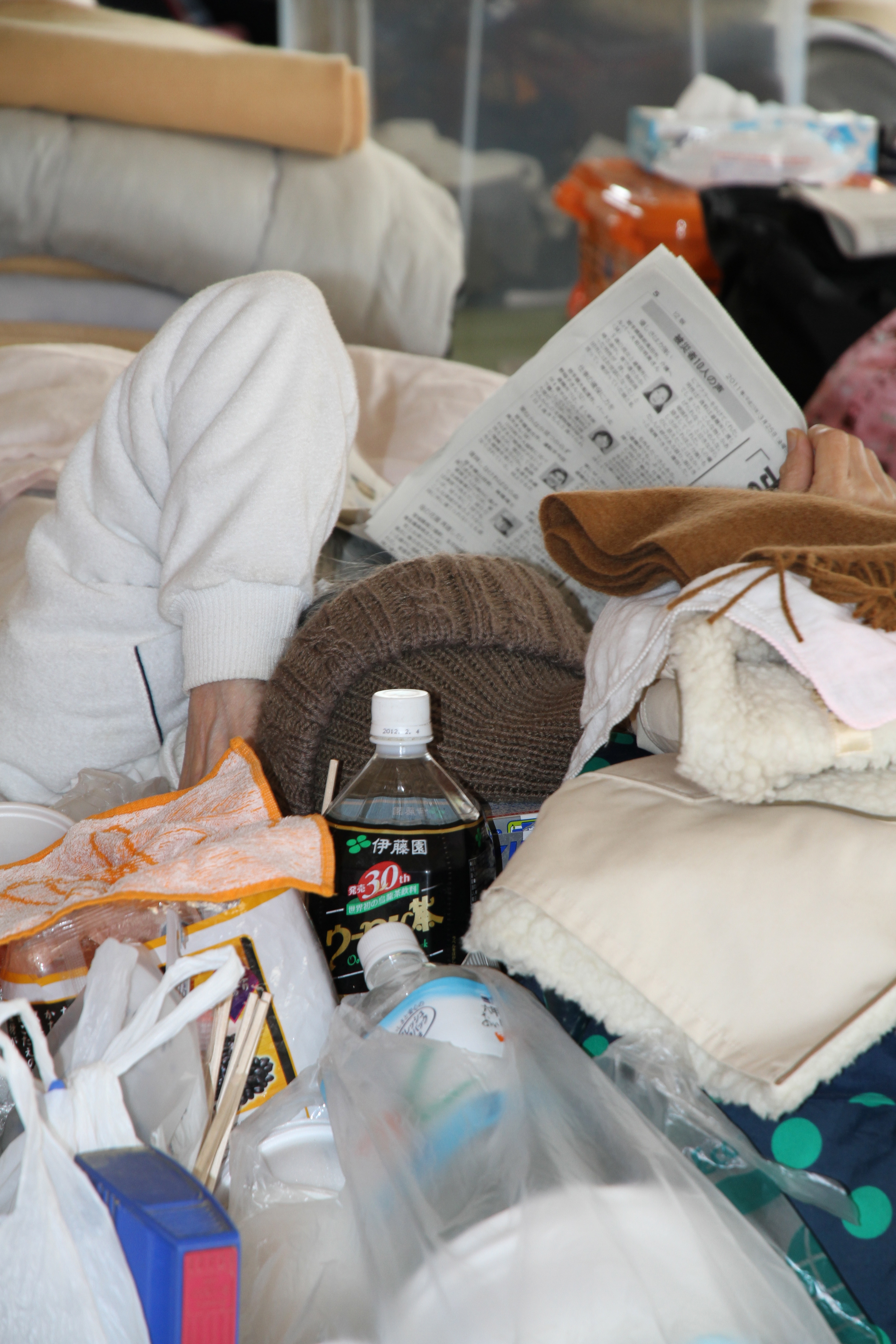 We drink green tea warmed by the kerosene stoves parked around the futon clusters. Some search newspapers for the names of loved ones or friends, others gather in a corner to ponder their plight. During the day the younger evacuees go back to their homes to continue the clean up and to search for ways to rebuild their lives.